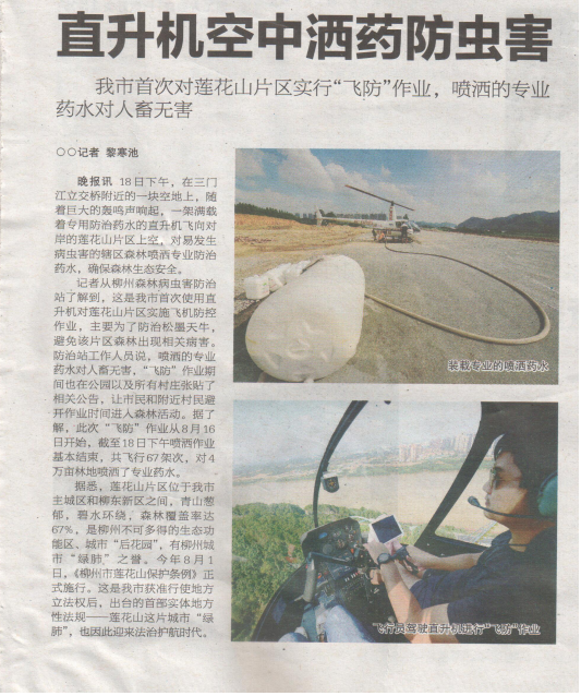 2017年8月16日-18日廣西科虹有害生物防治有限公司對(duì)三門江森林公園林區(qū)及周邊林區(qū)開(kāi)展飛防作業(yè),共飛行67架次,對(duì)4萬(wàn)畝林地噴灑了防治藥液。這是柳州市首次使用直升機(jī)對(duì)蓮花山片區(qū)進(jìn)行蟲害防治,此次作業(yè)主要防治松墨天牛,進(jìn)而防治該林區(qū)的松材線蟲病。柳州晚報(bào)對(duì)此次飛機(jī)防治作業(yè)進(jìn)行了報(bào)道。具體報(bào)道見(jiàn)圖1和圖2。