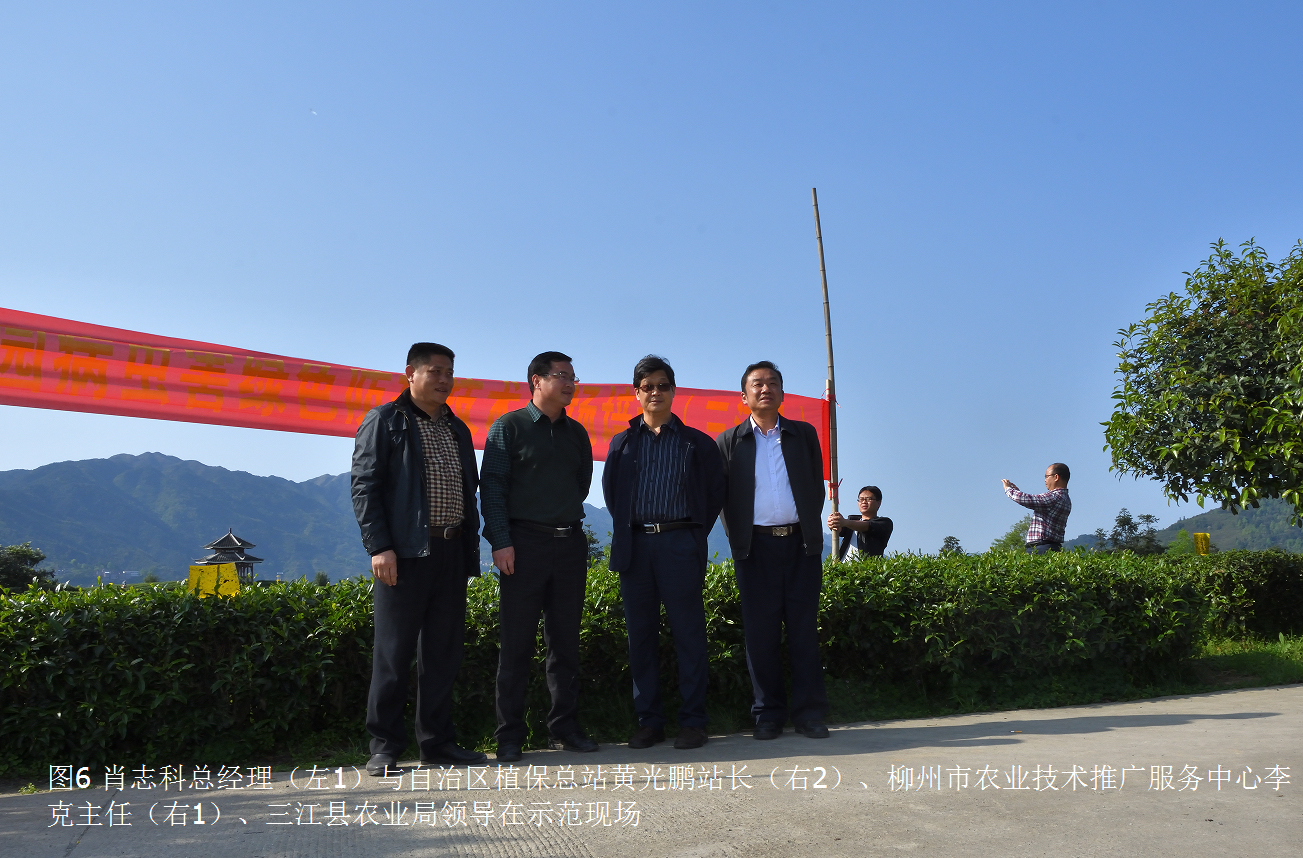 圖6 肖志科總經(jīng)理(左1)與自治區(qū)植保總站黃光鵬站長(zhǎng)(右2)、柳州市農(nóng)業(yè)技術(shù)推廣服務(wù)中心李克主任(右1)、三江縣農(nóng)業(yè)局領(lǐng)導(dǎo)在示范現(xiàn)場(chǎng)